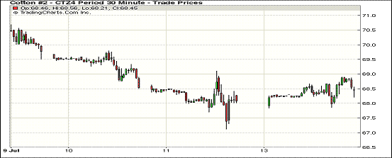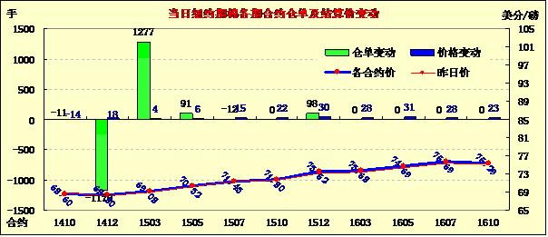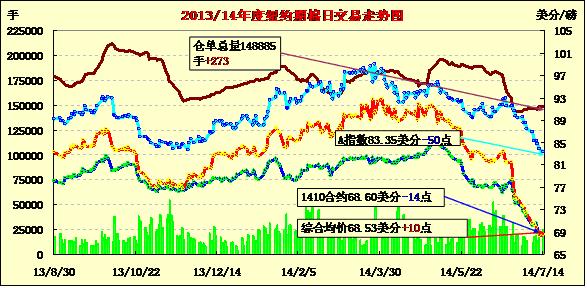 7月14日,紐約期棉除近期10月合約下跌外,其他合約均小幅上漲;10月合約結(jié)算價68.60美分/磅,跌14點;1412月合約收于68.30美分/磅,漲18點。由于市場利空消息紛紛兌現(xiàn),買家買盤令期棉止跌回穩(wěn),當日期棉開盤后普遍上漲,主力12合約結(jié)束6月27日以來持續(xù)下跌走勢,盤終小幅收漲18點,后市有望反彈;外部谷物市場和油籽期貨上漲。