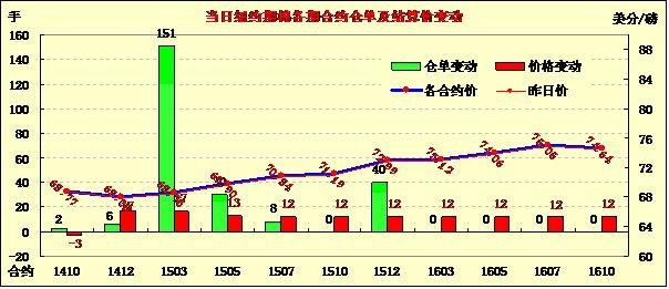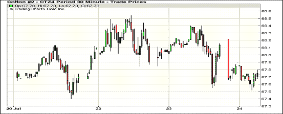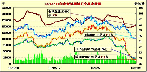 7月23日,市場預期今晚發(fā)布的美棉出口數(shù)據(jù)強勁,期棉小幅上漲;10月合約結(jié)算價68.77美分/磅,跌3點;1412月合約收于68.08美分/磅,漲17點。當日期棉開盤后先漲后跌,主力12月合約盤終前由68.40美分/磅高位跌至68美分以上,小幅收漲17點,市場成交量較前一日減少;外部商品市場大豆上漲。盡管市場仍預期美棉產(chǎn)量上升,短期美棉銷售數(shù)據(jù)利好對棉價形成暫時支撐,USDA8月份預測報告發(fā)布在即,預計棉價仍將繼續(xù)走低。
