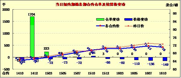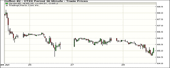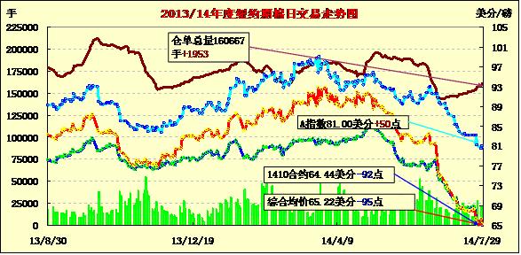 7月29日,受美國德州高地平原持續(xù)降雨利空消息打壓,期棉整體下跌,跌幅均在百點以下;10月合約結算價64.44美分/磅,跌92點;1412月合約收于65.01美分/磅,跌87點。當日期棉開盤后大幅下跌,主力合約跌幅超百點,盤終收跌87點再創(chuàng)新低,期棉下跌趨勢不改;外部商品市場谷物和油籽均下跌。市場預估新年度美棉增產及USDA預測報告利空抵消市場買盤支持,近期期棉仍有繼續(xù)下挫趨勢。