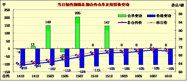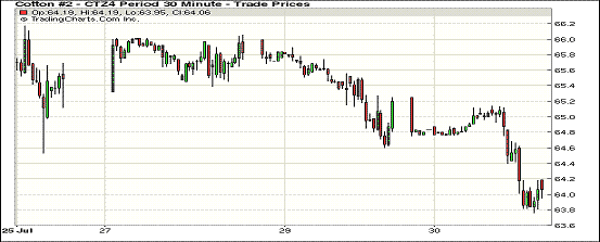 7月30日,市場賣盤壓力打壓期棉遠近合約大幅下跌;10月合約結(jié)算價63.34美分/磅,跌110點;1412月合約收于64美分/磅,跌101點。當(dāng)日期棉開盤后先漲后跌,市場投機性賣盤對棉價形成壓力,盤終下跌超百點再創(chuàng)新低,收于64美分下方;外部商品市場玉米和大豆下跌。新年度美棉預(yù)期增產(chǎn)、德州西部再迎利好降水等消息對棉價形成利空打壓,此外USDA 8月供需報告預(yù)計仍將對棉價形成壓力,關(guān)注今晚發(fā)布的美棉出口周報。