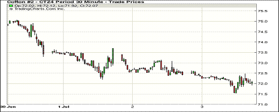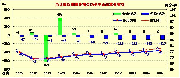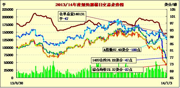 7月3日,預(yù)期美棉供應(yīng)過剩及美棉出口數(shù)據(jù)低迷打壓;7月合約結(jié)算價(jià)76.22美分/磅,跌47點(diǎn);10月合約結(jié)算價(jià)71.79美分/磅,跌47點(diǎn);1412月合約收于72.06美分/磅,跌41點(diǎn)。當(dāng)日期棉延續(xù)本周以來疲弱走勢(shì)持續(xù)下跌,主力12合約震蕩區(qū)間71.52-72.62美分/磅,盤終收于72.06美分/磅再創(chuàng)新低;外部商品市場(chǎng)玉米和大豆繼續(xù)下跌。