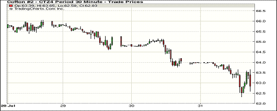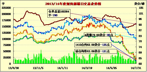 7月最后一個(gè)交易日,因庫存憂慮蓋過出口數(shù)據(jù)強(qiáng)勁,紐約期棉連續(xù)第三個(gè)交易日走低,近期1410月合約結(jié)算價(jià)62.09美分/磅,跌125點(diǎn);主力1412月合約結(jié)算價(jià)62.87美分/磅,跌113點(diǎn);其他遠(yuǎn)期合約跌幅78-216點(diǎn)不等。當(dāng)日主力合約上半場基本穩(wěn)定在63.5美分/磅,美棉出口數(shù)據(jù)利好并未對市場產(chǎn)生影響,庫存壓力打壓該合約下半場下滑至當(dāng)日最低點(diǎn)61.90美分/磅,盤終收跌百余點(diǎn)。該合約7月份累計(jì)跌1064點(diǎn),跌幅14.5%;過去兩個(gè)月累計(jì)大跌33%。紐期登記庫存本月較少318924包,為1月份以來最低值。分析指出,期棉穩(wěn)步下滑,因上月美國農(nóng)業(yè)部稱,預(yù)期2014/15年度末美棉庫存將升至約500萬包的六年高位,全球棉花庫存將增至約1.06億包的紀(jì)錄高位。
