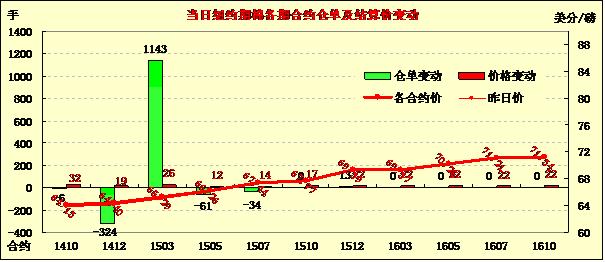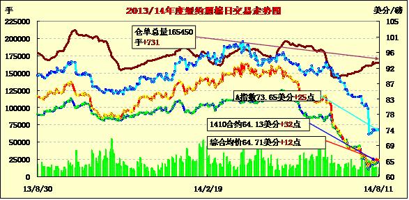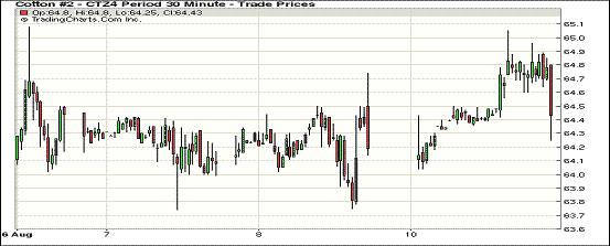 8月11日,因交易商在USDA月報公布前結(jié)清頭寸,紐約期棉繼續(xù)小幅上揚,近期1410月合約結(jié)算價64.13美分/磅,漲32點;主力1412月合約結(jié)算價64.40美分/磅,漲19點;遠期1503月合約收于65.29美分/磅,漲26點。當日主力12月合約早盤在64.4美分/磅一線徘徊;午盤后投機空頭結(jié)清頭寸促市場上揚,該合約至當日最高點65.05美分/磅,之后圍繞64.7美分/磅震蕩,尾盤時分滑落回吐部分漲幅但盤終仍小幅收漲。當日外部商品市場也普遍走高。市場廣泛預(yù)期將于今晚公布的USDA月報將上調(diào)美國棉花產(chǎn)量預(yù)估,但交易商稱對美國棉花豐產(chǎn)的預(yù)期已被市場消化。
