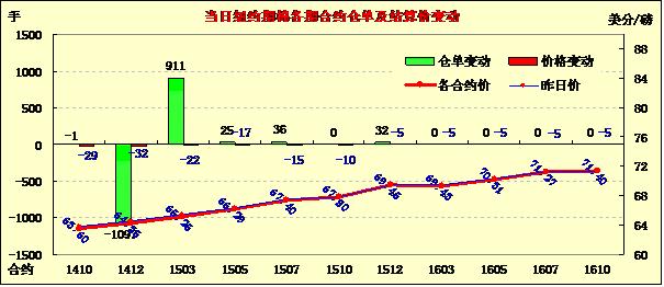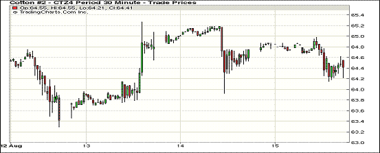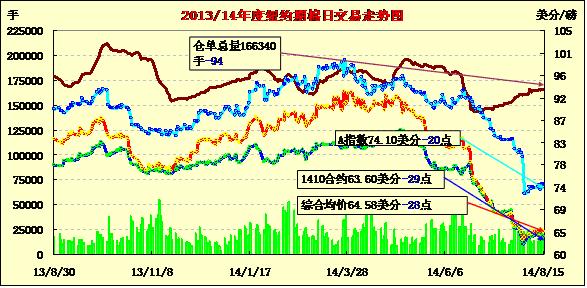 8月15日,紐約期棉小幅回落,近期1410月合約結(jié)算價63.60美分/磅,跌29點;主力1412月合約結(jié)算價64.35美分/磅,跌32點;1503月合約收于65.25美分/磅,跌22點。市場交投持續(xù)清淡。當(dāng)日主力12月合約早盤圍繞64.8美分/磅震蕩,午盤后受賣盤打壓跌至64.4美分一線,當(dāng)日震蕩區(qū)間83點,盤終小幅走低。本周1410月合約累計跌21點;1412月合約漲14點。本周公布的USDA月度供需報告對市場不利,但基本符合市場預(yù)期,且已在之前的跌勢中被消化;周四公布的周度出口銷售報告令人失望,使棉價承壓。