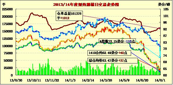 8月1日為2014/15國(guó)際棉花年度開端,市場(chǎng)在嚴(yán)重超賣后以小幅上漲收盤,前三份合約均上漲40點(diǎn),近期10月合約結(jié)算價(jià)62.49美分/磅,主力12月合約結(jié)算價(jià)63.27美分,1503結(jié)算價(jià)63.91美分。當(dāng)日市場(chǎng)早盤弱勢(shì)徘徊,12月合約在跌破63美分后逼向62美分,后在此水平獲得支撐,經(jīng)歷短時(shí)間整理后拉出陽(yáng)線,在挑戰(zhàn)64美分失敗后在63-64美分區(qū)間震蕩,最終收盤穩(wěn)定于該區(qū)間。5月份以來(lái)市場(chǎng)跌幅加深,近月合約跌幅超過(guò)20美分,整個(gè)7月份12月合約下跌累計(jì)幅度達(dá)到14.5%,市場(chǎng)超跌有反彈需求。出口角度來(lái)看,2013/14年度美棉出口完成USDA(美國(guó)農(nóng)業(yè)部)預(yù)期總出口量的99%,新年度已簽約量完成預(yù)期量的36%。