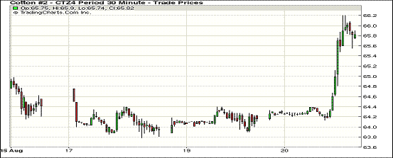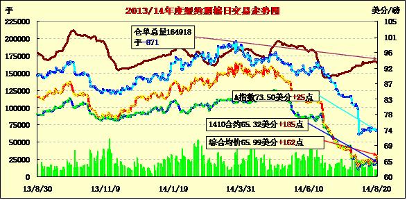 8月20日,紐約期棉普遍大幅收漲,近期1410月合約結(jié)算價65.32美分/磅,漲185點;主力1412月合約結(jié)算價65.81美分/磅,漲165點;遠(yuǎn)期1503月合約收于66.51美分/磅,漲148點。當(dāng)日市場交投活躍。當(dāng)日主力12月合約上半場在64-64.5美分/磅之間平穩(wěn)運行;午盤后空頭回補買盤入市促市場上揚,該合約突破66美分阻力位,當(dāng)日最高至66.20美分/磅;盤終收于7月28日以來最高值。由于對美國棉花豐產(chǎn)的預(yù)期不斷升溫,導(dǎo)致ICE12月合約價格從3月觸及的97美分左右高位回落了約30%,該合約在8月1日觸及近五年低位62.02美分,價格下跌使生產(chǎn)商停止賣出。市場很容易出現(xiàn)短期反彈,升至68-69美分,預(yù)計在該水準(zhǔn)農(nóng)戶將重新開始賣出。
