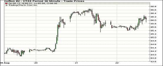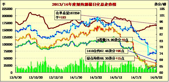 8月22日,紐約期棉整體收漲,近期1410月合約結(jié)算價67.46美分/磅,漲96點;主力1412月合約結(jié)算價66.18美分/磅,漲26點;1503月合約收于66.57美分/磅,漲15點。市場成交量繼續(xù)回落。當日主力12月合約早盤在65.6美分/磅上下震蕩,午盤后受買盤支持一路上揚,盤終連續(xù)第四個交易日收高。該合約本周累計漲183點;1410月合約累計漲386點;1503月合約漲132點。美國德州旱情影響棉花生長,供應(yīng)缺口可能會在舊作售罄而新作尚未上市的空檔期出現(xiàn),這對期棉價格形成提振。美國德州旱情影響棉花生長,供應(yīng)缺口可能會在舊作售罄而新作尚未上市的空檔期出現(xiàn),這對期棉價格形成提振。