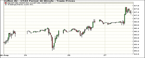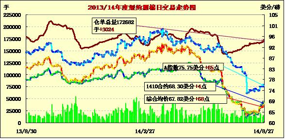 8月27日,受技術(shù)性買(mǎi)盤(pán)及外部谷物市場(chǎng)走高支持,紐約期棉延續(xù)前一日走勢(shì)繼續(xù)上揚(yáng),近期1410月合約結(jié)算價(jià)68.30美分/磅,漲4點(diǎn);主力1412月合約結(jié)算價(jià)67.46美分/磅,漲57點(diǎn);遠(yuǎn)期1503月合約收于67.81美分/磅,漲57點(diǎn)。當(dāng)日市場(chǎng)平穩(wěn)開(kāi)盤(pán),主力合約上半場(chǎng)穩(wěn)定66.6-66.8美分/磅之間;午盤(pán)后技術(shù)性買(mǎi)盤(pán)入市促市場(chǎng)走高,同時(shí)外部谷物市場(chǎng)走高也對(duì)期棉形成支持;該合約交易尾段徘徊在67.4-67.6美分高位,盤(pán)終中幅收漲并刷新一個(gè)月高位。自7月24日以來(lái),期棉一直未能突破67美分的重要技術(shù)關(guān)口,其50日移動(dòng)均線(xiàn)切入位在約68美分。預(yù)計(jì)主力收在67美分水準(zhǔn)之上會(huì)為進(jìn)一步攀升鋪路。