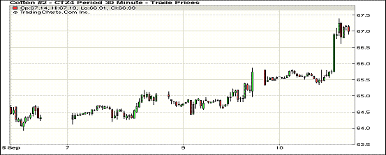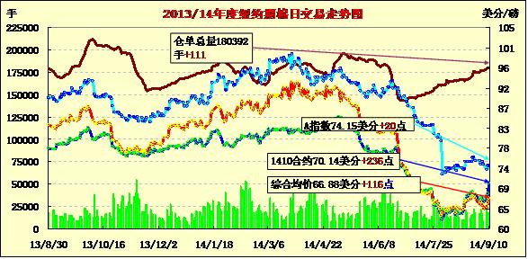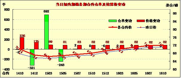 9月10日,由于USDA預(yù)計將在最新一期報告中調(diào)減產(chǎn)量以及美國德州主產(chǎn)區(qū)持續(xù)降溫,紐約期棉遠近合約普遍上漲,近期合約漲幅明顯;1410月合約結(jié)算價70.14美分/磅,漲236點;主力1412月合約結(jié)算價67.14美分/磅,漲135點;遠期1503月合約收于66.33美分/磅,漲89點。當日開盤后期棉各合約普遍上漲,主力12月合約最高漲至本月來高位67.39美分/磅,近期10月合約破70美分/磅,兩合約價差3美分。盡管棉價連續(xù)三日收漲,不過中國方面需求下滑仍將持續(xù)對后市棉價形成壓力;關(guān)注即將發(fā)布的USDA報告,預(yù)計美棉產(chǎn)量在1710-1740萬包之間。