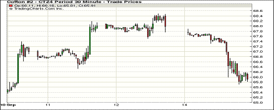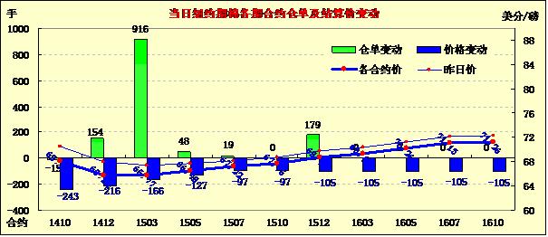 9月15日,USDA月報(bào)利好兌現(xiàn)完成后,投資者獲利平倉對(duì)棉價(jià)形成壓力,紐約期棉各合約大幅下挫;1410月合約結(jié)算價(jià)68.18美分/磅,跌243點(diǎn);主力1412月合約結(jié)算價(jià)65.美分/磅,跌216點(diǎn);遠(yuǎn)期1503月合約收于65.77美分/磅,跌166點(diǎn)。當(dāng)日開盤后即大幅下滑,市場(chǎng)出現(xiàn)賣盤打壓棉價(jià)快速下跌,盤終主力合約跌216點(diǎn)至65.84美分/磅,近期10月合約跌幅明顯,遠(yuǎn)期合約下跌均在百點(diǎn)以上;12/3月合約價(jià)格進(jìn)一步縮小至7點(diǎn),上周五為57點(diǎn)。長期來看,新年度全球供應(yīng)量仍嚴(yán)重過剩,利空消息仍揮之不散,國際棉價(jià)長遠(yuǎn)走勢(shì)仍將存在巨大壓力,關(guān)注60美分/磅關(guān)點(diǎn)。