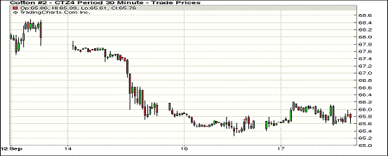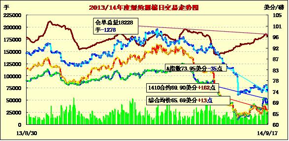 9月17日,紐約期棉結(jié)束跌勢(shì)整體反彈,近期合約漲幅明顯;1410月合約結(jié)算價(jià)69.90美分/磅,漲162點(diǎn);主力1412月合約結(jié)算價(jià)65.68美分/磅,漲13點(diǎn);遠(yuǎn)期1503月合約收于65.58美分/磅,漲19點(diǎn)。當(dāng)日早盤期棉小幅下跌,后略有反彈,盤終近期10月合約大幅上漲超百點(diǎn),主力合約及遠(yuǎn)期合約均小幅上漲,12/3月價(jià)差縮至10點(diǎn)。美國(guó)主產(chǎn)區(qū)德州西部近期天氣條件對(duì)新花生長(zhǎng)不利,新花質(zhì)量可能因此降低;關(guān)注今晚發(fā)布的美棉出口周報(bào)。