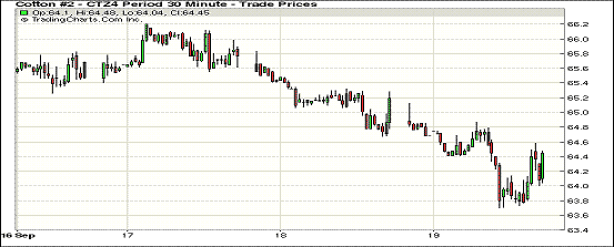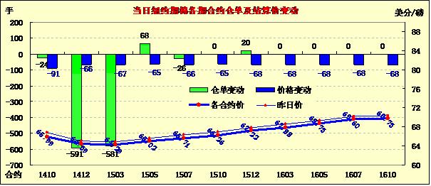 本周最后一個交易日,全球庫存預(yù)期增加仍是棉價下跌的最大推手,9月19日期棉繼續(xù)收跌;1410月合約結(jié)算價65.99美分/磅,跌91點;主力1412月合約結(jié)算價67.39美分/磅,跌66點;遠(yuǎn)期1503月合約收于64.29美分/磅,跌67點。當(dāng)日期棉開盤后繼續(xù)維持較弱走勢,盤終近期合約下跌91點,其他合約跌幅均在60-70點之間,主力合約最高漲至65.12美分/磅,此前6個交易日棉價5日下跌,跌幅達(dá)到370點;當(dāng)日外部市場漲跌不一。上周美棉出口數(shù)據(jù)利空、新花采摘壓力、中國整體經(jīng)濟(jì)蕭條,以及棉花新政發(fā)布等因素均對棉價形成壓力,期棉市場利空消息不斷,預(yù)計后市仍有持續(xù)下跌可能。