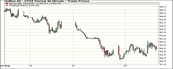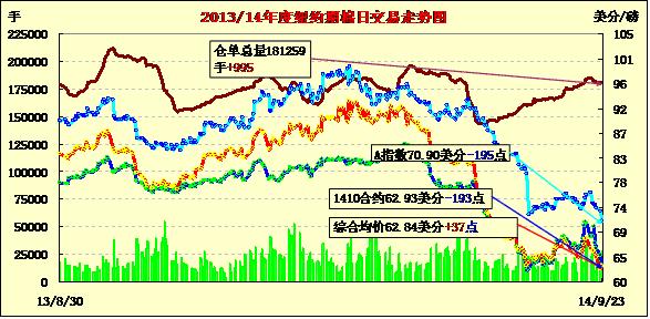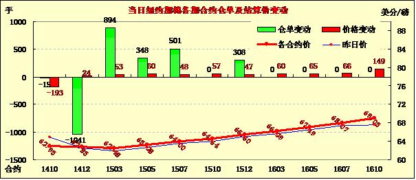 9月23日,市場消費買盤促棉價小幅回升;1410月合約結(jié)算價62.93美分/磅,跌193點;主力1412月合約結(jié)算價62.83美分/磅,漲24點;遠期1503月合約收于62.48美分/磅,漲53點。當日開盤后期棉上漲反彈,10月合約在第一通知日(24日)前大幅收跌,跌幅193點,主力12月合約最高漲至63.29美分/磅,盤終小幅收漲;外部市場玉米和大豆下跌,連續(xù)四個交易日下挫。隨中國新政發(fā)布,紐約棉價將會長期承受打壓,全球供應增加將會令棉價進一步下跌。