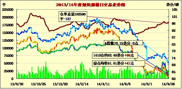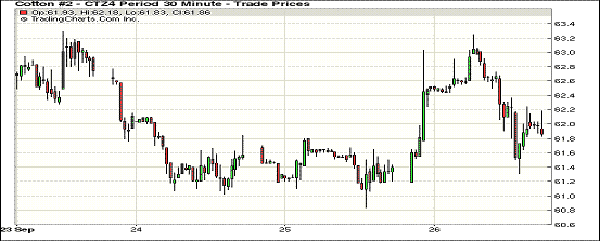 9月26日,紐約期棉市場先跌后漲,主力12月合約結(jié)算價(jià)61.89美分/磅,漲49點(diǎn),1503月合約61.46美分,漲42點(diǎn)。當(dāng)日主力12月合約低開后反彈到63美分以上,未能支撐太久便出現(xiàn)下跌,跌幅過百后有直破61美分關(guān)鍵位的勢頭,但最終在該水平獲得支撐,以略低于62美分收盤。分析師指出,中國關(guān)于增發(fā)配額和內(nèi)地補(bǔ)貼方面的消息對ICE期棉市場形成壓力,盤中主力合約跌至近五年新低點(diǎn)水平,市場將繼續(xù)考驗(yàn)60美分支撐位。
