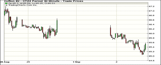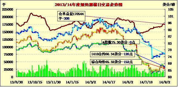 9月2日,受多方面因素打壓,紐約期棉普遍下跌,跌幅均超百點(diǎn);1410月合約結(jié)算價(jià)66.34美分/磅,跌126點(diǎn);主力1412月合約結(jié)算價(jià)65.31美分/磅,跌126點(diǎn);遠(yuǎn)期1503月合約收于65.28美分/磅,跌173點(diǎn)。當(dāng)日期棉開(kāi)盤后持續(xù)下跌,后受到美元指數(shù)持續(xù)走強(qiáng)、印度棉區(qū)利好降雨以及中國(guó)棉價(jià)持續(xù)下跌影響,主力12月合約盤終收跌126點(diǎn),其余合約跌幅均超百點(diǎn)。