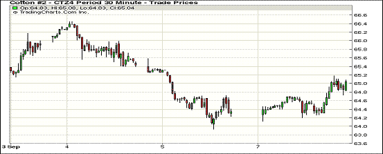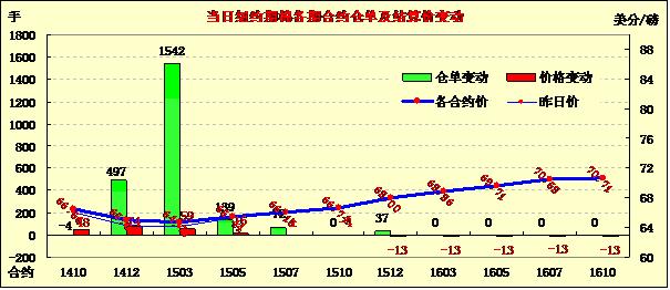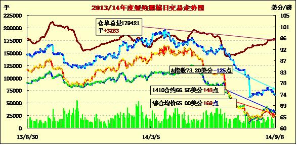 9月8日棉價近漲遠跌;1410月合約結(jié)算價66.56美分/磅,漲48點;主力1412月合約結(jié)算價65.05美分/磅,漲74點;遠期1503月合約收于64.73美分/磅,漲59點。當(dāng)日期棉開盤后普遍上漲,午盤后漲至高點,盤終近期合約收漲,遠期合約下跌,12/3月價差32點,上周五為17點;谷物與油籽期貨上漲。