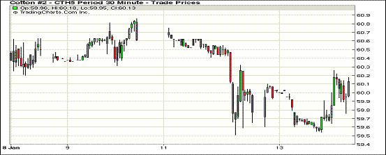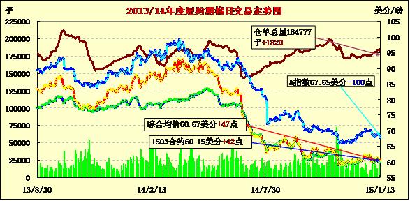 1月13日,紐約期棉合約反彈,主力合約重回60美分;1503月合約結(jié)算價60.15美分/磅,漲42點,主力1505月合約收于60.89美分/磅,漲47點。當日開盤后主力合約震蕩上漲,午后重回60美分/磅,并達到當日最高點60.26美分,盤終回落,最終收于震蕩區(qū)間中部。3/5月合約價差擴大,至74點。