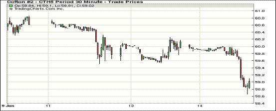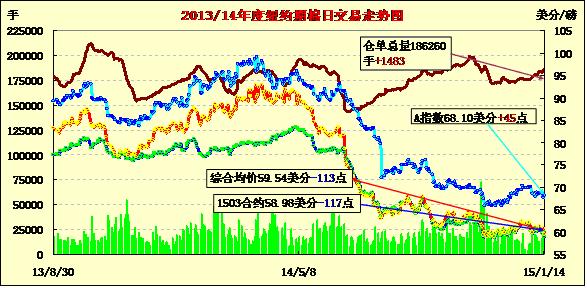 1月14日,紐約期棉所有合約再次大幅下跌,超過100點(diǎn);1503月合約結(jié)算價(jià)58.98美分/磅,跌117點(diǎn),主力1505月合約收于59.83美分/磅,跌106點(diǎn)。當(dāng)日紐約期棉合約低開,之后主力合約在13日價(jià)格區(qū)間內(nèi)震蕩,5月合約小幅下跌,臨近收盤時(shí)大幅下跌,主力合約跌幅近2%,創(chuàng)下去年11月24日來最低收盤價(jià);3/5月合約價(jià)差擴(kuò)大,至85點(diǎn)。14日紐約棉花期貨受全球股市大跌影響走低,道瓊斯工業(yè)平均數(shù)指數(shù)下跌300點(diǎn),較預(yù)期更弱的美國零售和對(duì)全球經(jīng)濟(jì)增長的擔(dān)憂加劇了棉市的悲觀情緒。
