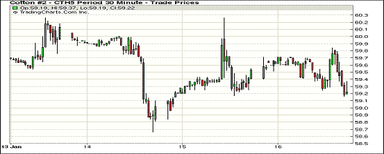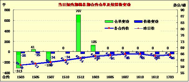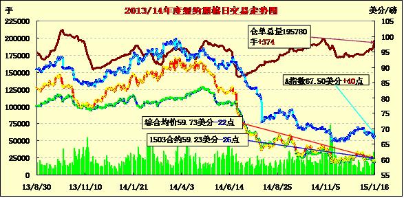 出于對全球經(jīng)濟長期放緩和長期供應(yīng)過剩的擔(dān)憂,1月16日紐約期棉合約整體下跌20-50點;1503月合約結(jié)算價59.23美分/磅,跌26點,主力1505月合約收于60.02美分/磅,跌25點。當(dāng)日主力合約低開,隨后多次反彈但均受阻失敗,最終收跌;3/5月合約價差79點。