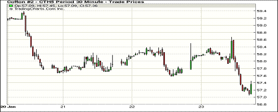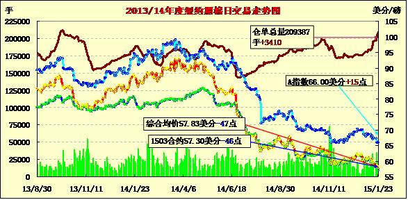 1月23日美棉出口數(shù)據(jù)發(fā)布,紐約期棉走勢先揚后抑,主力合約再創(chuàng)新低;1503月合約結(jié)算價57.30美分/磅,跌46點,1505月合約收于58.20美分/磅,跌45點。當(dāng)日開盤后期棉受美棉出口影響上漲,最高價58.67,但不久后下跌,盤終收于新低,最低價57.05。3/5月合約價差90點。周五美棉出口數(shù)據(jù)強勁,但I(xiàn)CE期棉不漲反跌,市場可能迎來一波新的頹勢。此外,美元不斷走強,也對未來美棉的出口帶來一定阻礙。