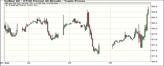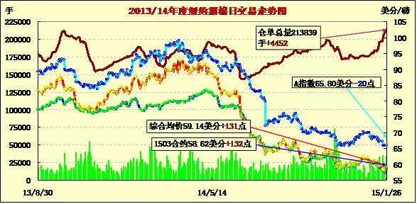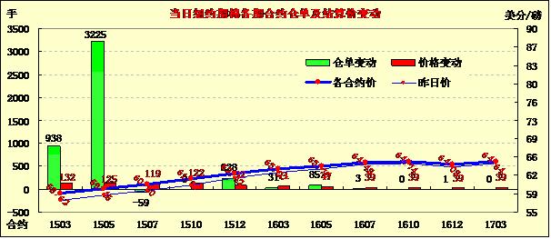 周一紐約期棉大漲,近月合約漲100點以上,3月合約重新站上58美分/幫;主力1503月合約結(jié)算價58.62美分/磅,漲132點;遠(yuǎn)期1505月合約收于59.45美分/磅,漲125點。當(dāng)日3月合約開盤后震蕩上行,之后下滑至當(dāng)日最低點57.26美分/磅,臨近收盤時大漲,最終收于當(dāng)日高位,漲幅2.30%。3/5月合約價差83點。上周末克利夫蘭預(yù)測報告稱下年度全球棉花種植面積將下降10%-15%,需求有所回升。截至上周末美棉分級已達(dá)預(yù)計產(chǎn)量的97%。