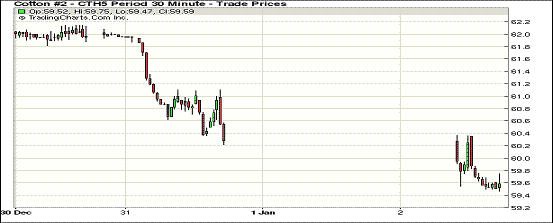 2015年1月2日,美棉銷售情況較前周大幅下滑,紐約期棉再度收跌;主力1503月合約結(jié)算價59.58美分/磅,跌69點;1505月合約收于60.25美分/磅,跌82點。當日紐約期棉各合約平開低走,主力3月合約盤終再次跌破60美分/磅關(guān)點;節(jié)日氛圍仍制約市場成交,預計下周緩慢回升;外部谷物市場小麥和油籽期貨下跌。12.19-12.25一周美國凈簽約出口本年度陸地棉20276噸(較前一周減72%,較近四周均值減54%),裝運38465噸。