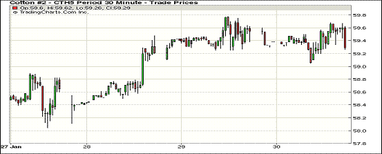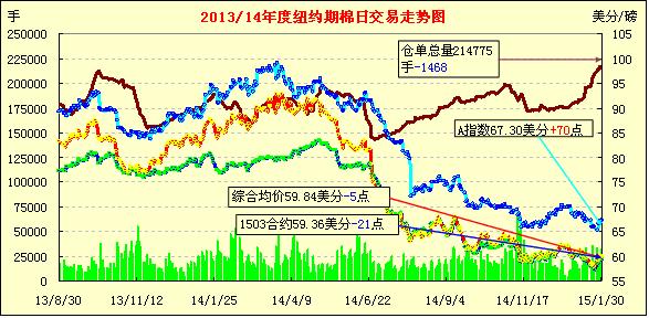 1月30日紐約期棉小跌,合約價仍處于窄幅震蕩;1503月合約結(jié)算價59.36美分/磅,跌21點,1505月合約收于60.02美分/磅,跌33點。當日3月合約低開,全天走勢不振,跌幅0.35%。截至22日,美棉出口累計已達USDA預計出口量的94%,但期棉尚未擺脫劣勢,本周最后一個交易日,3月合約較本周初上漲3.6%,但較月初跌1.5%。