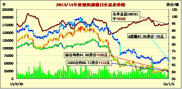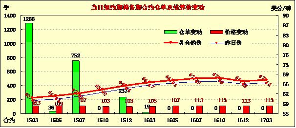 周一紐約期棉合約全線大幅反彈,所有合約上漲超100點,收于60美分以上;主力1503月合約結(jié)算價60.71美分/磅,漲113點;遠期1505月合約收于61.34美分/磅,漲109點。當日主力合約高開,之后震蕩上行,午后達到最高點61.14美分/磅,盤尾回落,收于58.53-63.70磅/美分區(qū)間中。3/5月合約價差63點。雖然近期紐約期貨走弱,但11月中下旬以來未平倉合約總體呈增加趨勢,以及近幾周美棉出口量高居,市場關(guān)注即將發(fā)布的USDA世界供需預測,預計新花產(chǎn)量調(diào)增,美國出口增加。