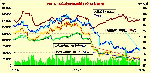 1月6日紐約期棉價格回落,近月合約收于當(dāng)日波動區(qū)間低位;主力1503月合約結(jié)算價60.20美分/磅,跌51點(diǎn);遠(yuǎn)期1505月合約收于60.76美分/磅,跌58點(diǎn)。當(dāng)日開盤后,主力3月合約穩(wěn)步攀升,最高點(diǎn)61.14,之后回落,盤終收跌。3/5月合約價差56點(diǎn)。昨ICAC發(fā)布2015年第一期平衡表,預(yù)計2015年度各主產(chǎn)區(qū)及世界總產(chǎn)量均下降,期末庫存調(diào)減,但由于期末庫存連續(xù)三年增加,棉價長期之內(nèi)依然不樂觀。