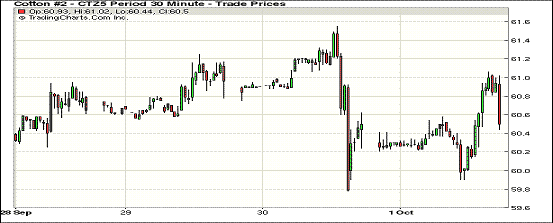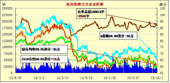 周四美棉出口穩(wěn)定,紐約期棉小幅上漲;1512月合約結(jié)算價(jià)60.60美分/磅,漲16點(diǎn),1603月合約60.29美分,跌2點(diǎn)。周四主力合約低開,小幅上漲后回落,最高價(jià)61.06美分/磅,最低價(jià)59.90美分/磅,最終微幅收漲。上周美棉簽約量不大但繼續(xù)保持穩(wěn)定,至9月24日,美棉簽約量達(dá)到USDA預(yù)測(cè)簽約量的32%,下周颶風(fēng)登陸美國(guó)東南部,將給棉區(qū)帶來大量降雨。