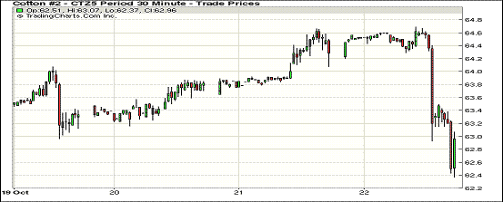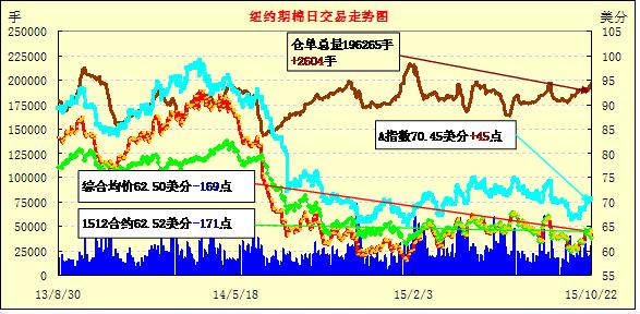 10月22日,受美元指數(shù)上漲,紐約期棉獲利回吐,所有合約大幅收跌;1512月合約結(jié)算價(jià)62.52美分/磅,跌171點(diǎn),1603月合約62.37美分,跌168點(diǎn)。當(dāng)日主力合約最高漲至64.69美分/磅,后遇阻力下探。后半場(chǎng)交易時(shí)賣盤打壓,買盤觀望,合約價(jià)下跌。周四公布的美棉最新出口顯示,截至15日當(dāng)周,美棉新花簽約量穩(wěn)定,本年度美棉簽約已達(dá)預(yù)計(jì)簽約總量的36%。當(dāng)日德州平原繼續(xù)降雨,但預(yù)計(jì)周五放晴。