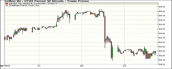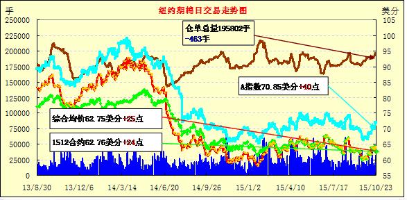 10月23日,紐約期棉小幅反彈收漲;1512月合約結(jié)算價62.76美分/磅,漲24點(diǎn),1603月合約62.60美分,漲23點(diǎn)。當(dāng)日12月合約高開,之后短暫保持漲勢,最高至63.07美分/磅,下半場交易時下跌,最終小幅收漲。隨著新棉上市進(jìn)度的加快,市場高等級棉的短缺越發(fā)明顯,日前德州降雨并沒有預(yù)期的嚴(yán)重,但依然對新花質(zhì)量造成影響。