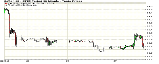 10月27日大宗商品價格普遍反彈,紐約期棉小幅收漲;1512月合約結算價62.34美分/磅,漲21點;1603月合約收于62.16美分/磅,漲23點。當日12月合約走勢大體平穩(wěn),多數(shù)時間在62.00-63.00美分/磅之內波動,下半場交易突破63.00美分/磅,收盤時回落,最終漲幅0.34%。雖然目前美棉銷售進度緩慢,但印度已開始CCI收購,同時中國棉價反彈,美棉產(chǎn)量大幅下降且?guī)齑嫣幱诘臀凰嚼闷趦r,棉價下行空間有限。
