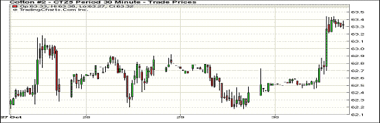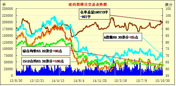 本周期棉連續(xù)窄幅調(diào)整震蕩,最終于周五大漲,12月合約突破62.00美分/磅,成交量略有增加;1512月合約結(jié)算價(jià)63.32美分/磅,漲100點(diǎn),1603月合約63.00美分,漲79點(diǎn)。30日早間,主力合約呈小幅上漲趨勢,下半場交易時(shí)買盤支撐走強(qiáng),其他合約收漲。周五美元指數(shù)走弱給棉價(jià)帶來一定支撐,德州不良天氣繼續(xù)阻礙采摘,若12月合約能穩(wěn)定在63.00美分/磅,棉價(jià)則有望繼續(xù)上漲。