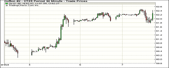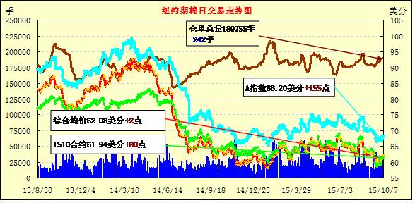 10月7日紐約期棉大部分合約價(jià)穩(wěn)定并收漲;1512月合約結(jié)算價(jià)62.05美分/磅,跌3點(diǎn);1603月合約收于61.95美分/磅,漲10點(diǎn)。 當(dāng)日主力合約早間交易平穩(wěn),價(jià)格窄幅波動(dòng),盤中沖高后回落,最低價(jià)接近61.80美分/磅,收盤前回升。市場關(guān)注本周發(fā)布的美國農(nóng)業(yè)部預(yù)測,若無重大利空消息,棉價(jià)可能持續(xù)反彈。