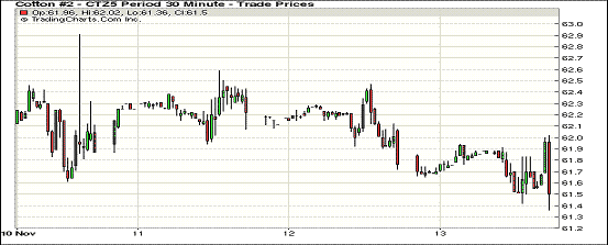 11月13日,紐約期棉繼續(xù)窄幅調(diào)整,主力合約遭賣盤打壓收跌;1512月合約結算價61.68美分/磅,跌16點,1603月合約61.99美分,跌17點。當日主力合約低開并小幅上漲,后保持小幅震蕩,下半場交易手賣盤壓力影響跌至新低61.56美分/磅。據(jù)海關統(tǒng)計數(shù)據(jù),10月中國棉花進口僅4.2萬噸,創(chuàng)2004年12月以來最低,美棉出口銷售受挫,雖東南亞進口增加,但尚未能堵住中國進口銳減的缺口,全球棉花進出口及需求前景并不樂觀。