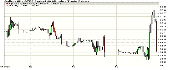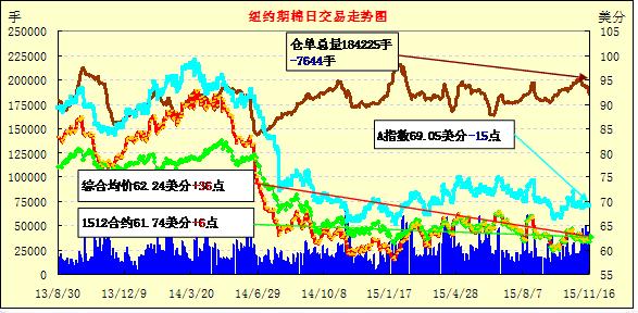 周一紐約期棉成交量增加,合約價(jià)上漲;1512月合約結(jié)算價(jià)61.74美分/磅,漲6點(diǎn),1603月合約62.61美分,漲62點(diǎn)。當(dāng)日主力合約在61.67-63.55美分/磅之間波動(dòng),早間交易時(shí)震蕩幅度較小,并有下跌趨勢(shì),買盤在收盤前刺激合約價(jià)上漲,最高63.55美分/磅為11月3日以來(lái)最高價(jià)。未來(lái)幾天美國(guó)德州平原和東南棉區(qū)再現(xiàn)惡略天氣,美國(guó)陸地棉分級(jí)檢驗(yàn)發(fā)現(xiàn)皮棉質(zhì)量下降,受天氣影響最嚴(yán)重的東南棉區(qū)可能放棄剩下未采收的新花。