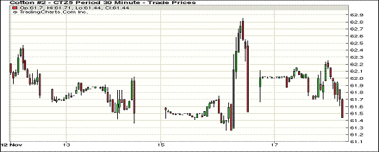 11月17日,紐約期棉放量持穩(wěn),主力合約全天走勢樂觀;1512月合約結(jié)算價(jià)61.53美分/磅,跌21點(diǎn),1603月合約62.67美分,漲6點(diǎn)。當(dāng)日主力合約走勢全天呈陽,盤中雖賣盤壓力較大但價(jià)格穩(wěn)定,收盤價(jià)基本持平。本周美國惡略天氣進(jìn)一步影響棉花采收和質(zhì)量,雖然銷售進(jìn)度落后,但美棉庫存處于低位使其面臨的銷售壓力大幅下降。