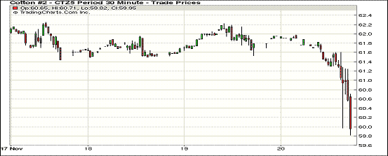 11月20日,紐約期棉重現(xiàn)弱勢(shì)調(diào)整格局;1512月合約結(jié)算價(jià)60.04美分/磅,跌154點(diǎn),1603月合約62.83美分,跌29點(diǎn)。當(dāng)日主力合約高開(kāi)低走,開(kāi)盤(pán)后弱勢(shì)走低,盤(pán)中在買(mǎi)盤(pán)支撐下上漲,但收盤(pán)前回落。周五期棉延續(xù)震蕩走勢(shì),近月12月合約下跌幅度較大,全球棉花庫(kù)存壓力較大,短期內(nèi)繼續(xù)給棉價(jià)帶來(lái)壓力。