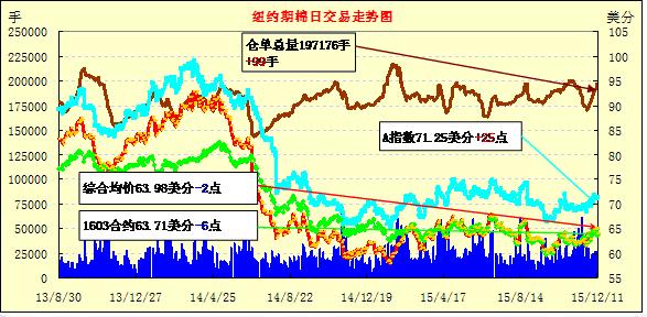 周五原油價(jià)格下跌,紐約期棉小幅收低;1603月合約結(jié)算價(jià)63.71美分/磅,跌6點(diǎn),1605月合約64.49美分,跌6點(diǎn)。當(dāng)日主力合約全天走勢(shì)平穩(wěn),早間交易時(shí)達(dá)到全天最高價(jià)63.91美分/磅,但成交清淡并小幅收低。本周公布的美棉簽約量畏縮,投資者對(duì)后市表示擔(dān)憂,雖然USDA報(bào)告偏利多,但減產(chǎn)的消息已基本消化,未來期棉走勢(shì)可能繼續(xù)保持小幅震蕩調(diào)整。