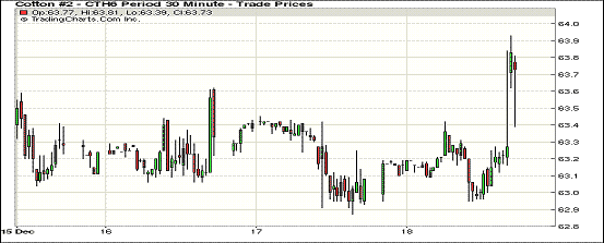 12月18日美元回落,紐約期棉小幅反彈;1603月合約結(jié)算價(jià)63.69美分/磅,漲70點(diǎn),1605月合約64.46美分,漲67點(diǎn)。當(dāng)日結(jié)束連續(xù)跌勢(shì)小幅收高,當(dāng)日主力合約兩次沖高,收盤前重回漲幅區(qū)域。周四發(fā)布的美棉出口雖有回升,但市場(chǎng)銷售依然疲軟并明顯落后于往年,基本面格局利空,加上美聯(lián)儲(chǔ)加息政策,棉價(jià)反彈有限。
