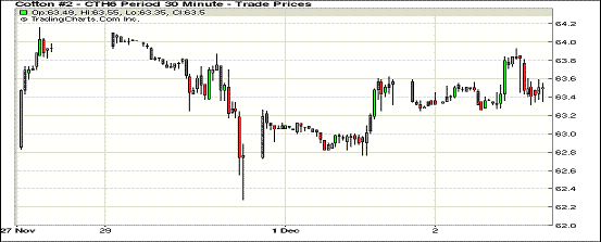 12月2日,紐約期棉小幅調(diào)整,合約結(jié)算價(jià)漲跌互現(xiàn);1512月合約結(jié)算價(jià)62.11美分/磅,跌9點(diǎn),1603月合約63.50美分,跌4點(diǎn)。當(dāng)日3月合約開(kāi)盤(pán)后小幅震蕩,后在買(mǎi)盤(pán)支撐下上漲,收盤(pán)前失去支撐下跌并持續(xù)走低。市場(chǎng)關(guān)注即將發(fā)布的美棉出口,最新ICAC預(yù)測(cè)再次下調(diào)世界棉花產(chǎn)量,并預(yù)測(cè)中國(guó)消費(fèi)樂(lè)觀。