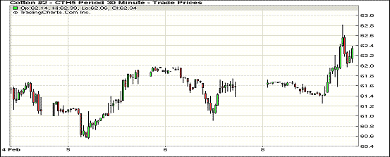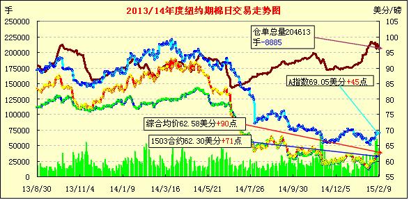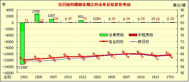上周末美國棉花協會年會預測下年度種植面積減少,消息利空,周一期棉在買盤刺激下全線上漲;1503月合約結算價62.30美分/磅,漲71點,1505月合約收于62.73美分/磅,漲110點。當日開盤后三月合約窄幅震蕩,隨后手賣盤影響上漲,當日最高價62.81,臨近收盤時回落,最終收漲。3/5月合約價差43點,成交量大增。周末美國棉花協會發(fā)布預測,下年度美棉種植面積減幅近15%,市場關注USDA供需報告,并看增美棉出口。