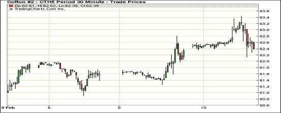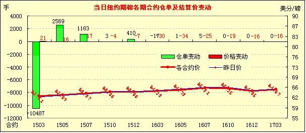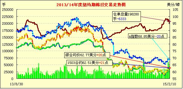 10日USDA供需預(yù)測(cè)上調(diào)年度美棉出口,紐約期棉延續(xù)漲勢(shì);主力1503月合約結(jié)算價(jià)62.51美分/磅,漲21點(diǎn);遠(yuǎn)期1505月合約收于62.89美分/磅,漲16點(diǎn)。當(dāng)日開(kāi)盤(pán)后3月合約延續(xù)漲勢(shì),后USDA報(bào)告發(fā)布,下調(diào)中國(guó)消費(fèi),上調(diào)年末庫(kù)存及美棉出口,臨近收盤(pán)是回落,當(dāng)日主力合約最高價(jià)63.44美分/磅,全天漲幅0.34%。3/5月合約價(jià)差38點(diǎn)。當(dāng)日成交量繼續(xù)增加。最新USDA供需報(bào)告上調(diào)世界年末庫(kù)存和美棉出口,下調(diào)中國(guó)消費(fèi)。受CCI競(jìng)賣(mài)支撐,印度棉價(jià)出口量不被看好,美棉出口或繼續(xù)走高,以此對(duì)ICE期棉形成支撐。