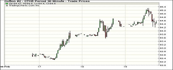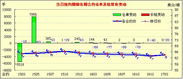 2月19日紐約期棉合約整體回落;1503月合約結(jié)算價(jià)64.44美分/磅,跌18點(diǎn),主力1505月合約收于64.69美分/磅,跌63點(diǎn)。當(dāng)日開盤后主力5月合約繼續(xù)前一交易日的漲勢,當(dāng)日最高價(jià)65.75,但最終收跌,跌幅0.28%,3/5月合約價(jià)差縮小至25點(diǎn)。美國農(nóng)業(yè)部預(yù)計(jì)2015/16年度種植面積970萬公頃,較本年度的1104萬公頃減幅12.1%,但高于美國棉花協(xié)會預(yù)測的940萬公頃,另外,受春節(jié)影響,美棉出口量看跌。