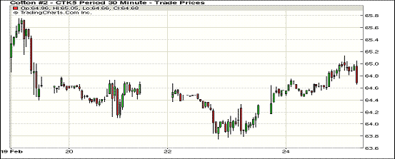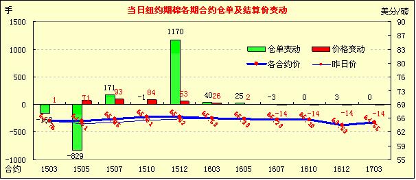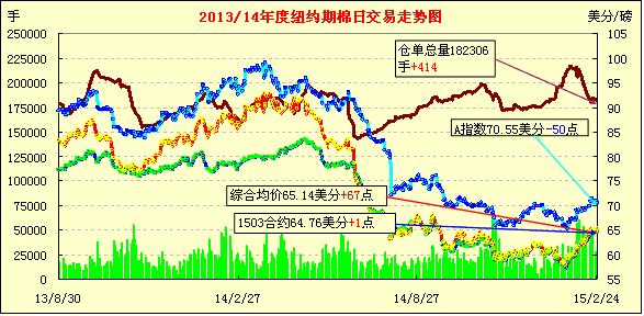 由于再次受到空頭回補,周二紐約期棉合約上漲;近期1503月合約結(jié)算價64.76美分/磅,漲1點,主力1505月合約收于64.91美分/磅,漲71點。當(dāng)日主力合約開盤后上漲,但很快跌至當(dāng)日最低價,之后觸底反彈上漲,最終漲幅1.10%。3/5月合約價差15點。春節(jié)期間,主力5月合約最高收盤價達到65.75美分/磅,登記庫存保持在低位,多方預(yù)測新年度行情樂觀,但印度方面缺乏利好消息,CCI競賣將繼續(xù)短期支撐棉價。