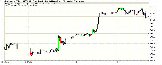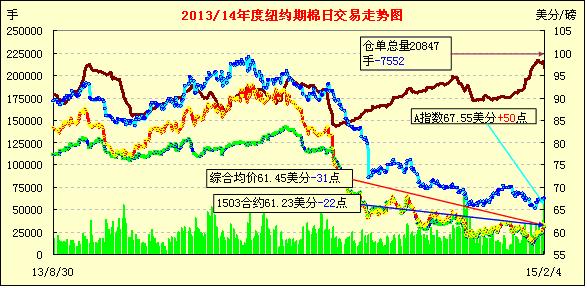 2月4日,由于外圍市場(chǎng)商品普遍下挫,期棉未能延續(xù)反彈走勢(shì)小幅收跌;主力3月合約收于61.23美分/磅,跌22點(diǎn);1505月合約61.32美分/磅,跌41點(diǎn)。受玉米、大豆和原油期貨下跌影響,紐約期棉當(dāng)日高開低走,主力3月合約盤終前跌至61點(diǎn)位附近,盤終小幅反彈仍收跌22點(diǎn);美元指數(shù)上漲,市場(chǎng)成交量連續(xù)三日交易活躍。受本年度棉價(jià)持續(xù)走低影響,ICAC預(yù)測(cè)下年度全球棉花種植面積下降6%,但本年度美棉和印度儲(chǔ)備尚未消化前,國(guó)際棉價(jià)反彈仍存在極大壓力。