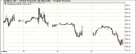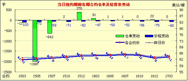 3月9日,美棉出口萎縮,市場(chǎng)買盤量有限,紐約期棉繼續(xù)下跌;近期3月合約收于61.92美分/磅,跌103點(diǎn);主力1505月合約62.25美分/磅,跌72點(diǎn)。當(dāng)日期棉開(kāi)盤后震蕩下行,盤終繼續(xù)收陰,主力合約在13個(gè)交易日內(nèi)11次收跌,市場(chǎng)成交量略有上升,近期3月合約當(dāng)日為最后交易日;外部谷物市場(chǎng)玉米和大豆期貨收漲。