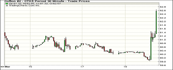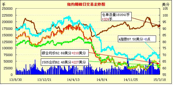 3月18日美元指數(shù)走弱,美聯(lián)儲最新政策刺激美股大漲,紐約期棉近月合約漲幅巨大;1505月合約結(jié)算價62.48美分/磅,漲227點,1507月合約收于62.87美分/磅,漲204點。當(dāng)日開盤后主力合約穩(wěn)步下跌,午后緩慢跌至當(dāng)日最低價59.83美分/磅,隨后受買盤影響沖高,全天漲幅3.77%。周三聯(lián)邦公開市場委員會降低了2015年所有經(jīng)濟指標(biāo)的預(yù)測值,美聯(lián)儲有意繼續(xù)放緩加息,刺激美股大漲,黃金、原油一起走高。