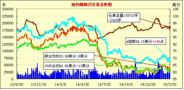 3月20日紐約期棉漲跌互現(xiàn),主力合約結(jié)束反彈;1505月合約結(jié)算價(jià)62.82美分/磅,跌13點(diǎn),1507月合約收于63.40美分/磅,漲8點(diǎn)。當(dāng)日主力合約低開,但多次沖高,最高價(jià)63.26美分/磅,但最終因買盤不足收跌,跌幅0.21%。7/12月合約價(jià)差66點(diǎn)。